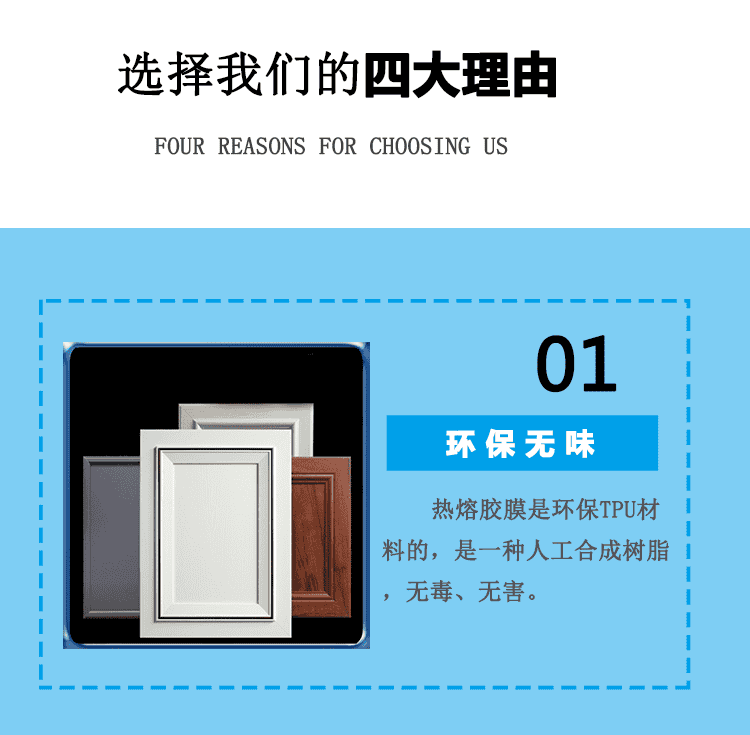 主要用于吸塑門、模壓門替代噴膠工藝,直接將膠膜貼合在PVC裝飾膜的背面,節(jié)省人工、提高質(zhì)量的同時又能降低成本.