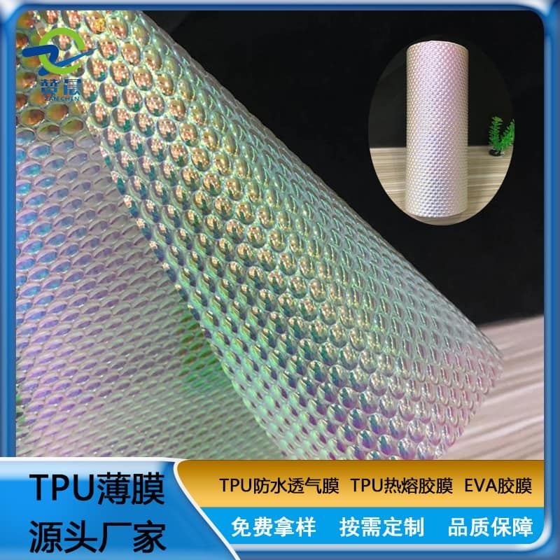 TPU彩虹膜的神奇效果在于不同距離、不同角度彩虹膜基材本身豐富的光效應會呈現出完全不同的幻彩效果。