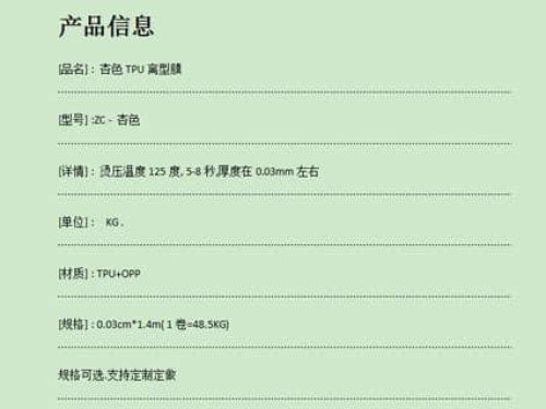 新款熱銷TPU離型膜,復合布料 免熱熔膠 免膠水 可直接復合為復合過程中省了很多環(huán)節(jié)型號:ZC-杏色品名:杏色-TPU離型膜規(guī)格:0.03mm*1.4m(可定制)耐溫:125度