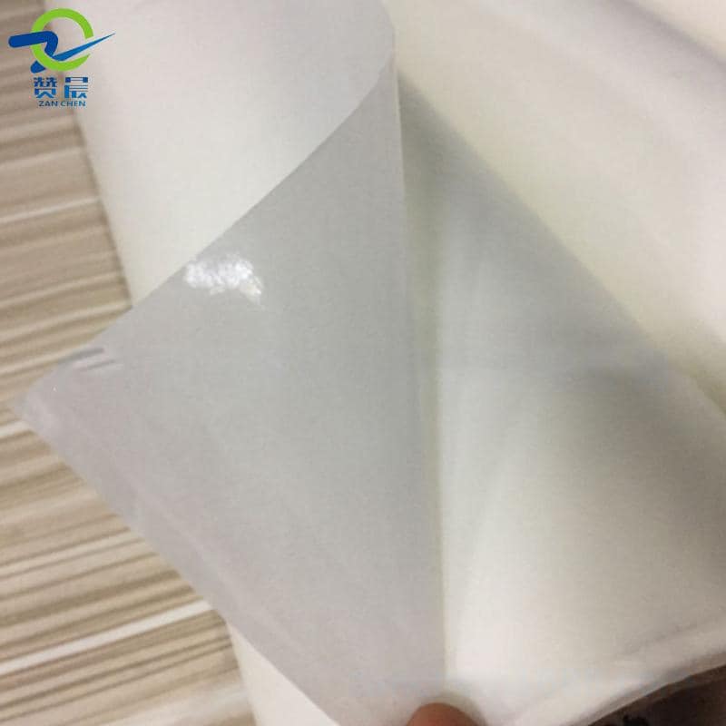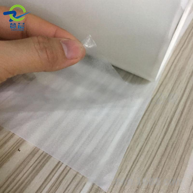 產(chǎn)品外觀:熱熔膠薄膜層+不粘膠的離型紙 (卷成一卷)